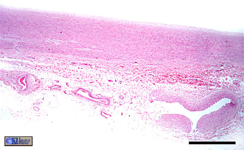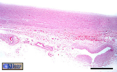 Low power cross section of the wall of the aorta. The lumen is on top. Notice the vasa vasorum in the lower tunica adventitia.